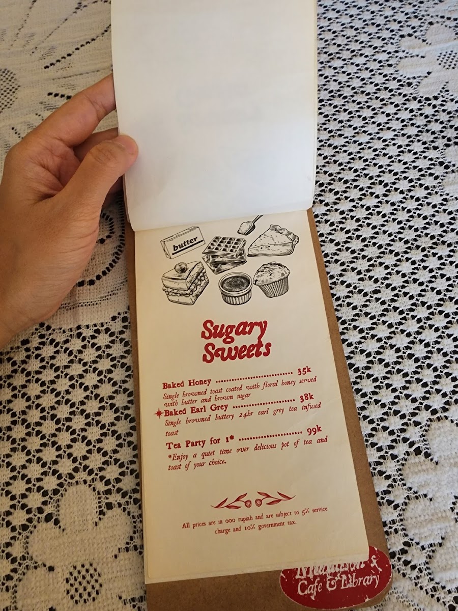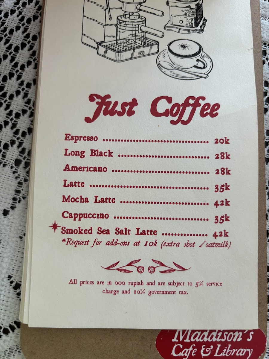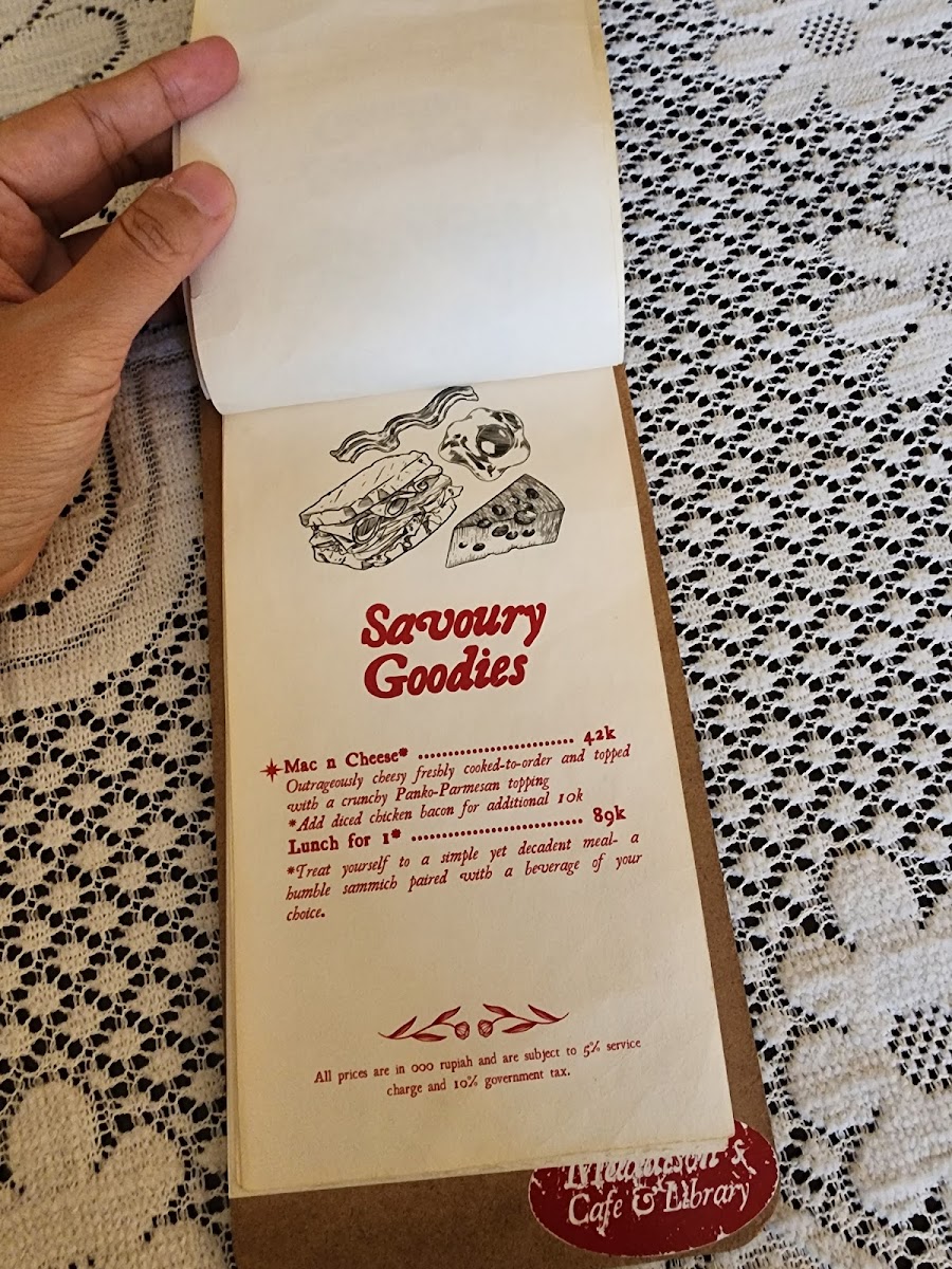 The menu is designed for casual dining, with options suitable for individuals seeking a quick drink or a light meal in a relaxed setting.